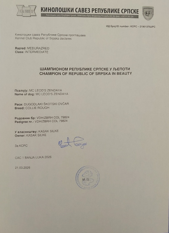 | 21.03.26 | CACIB I Banja Luka 2026 | Zoran Kos, BIH | V1, CAC, CACIB | ||